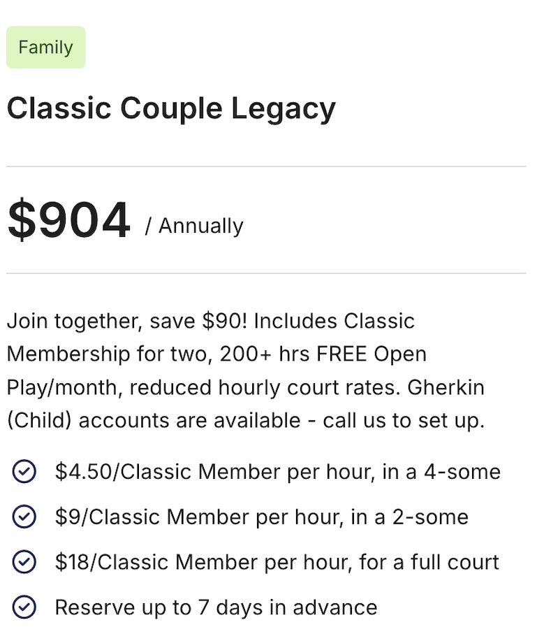Join together and save $90! This entitles a couple to annual access to the club at a reduced hourly court rate, with the ability to schedule 7 days in advance. There are 200+ hours of FREE Open Play/month. As a legacy Couple member, this annual membership cost will not change as long as you continue to renew each year.